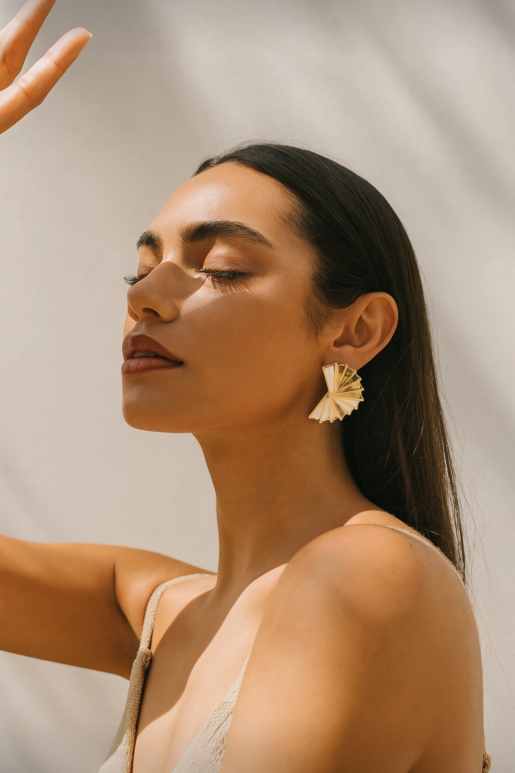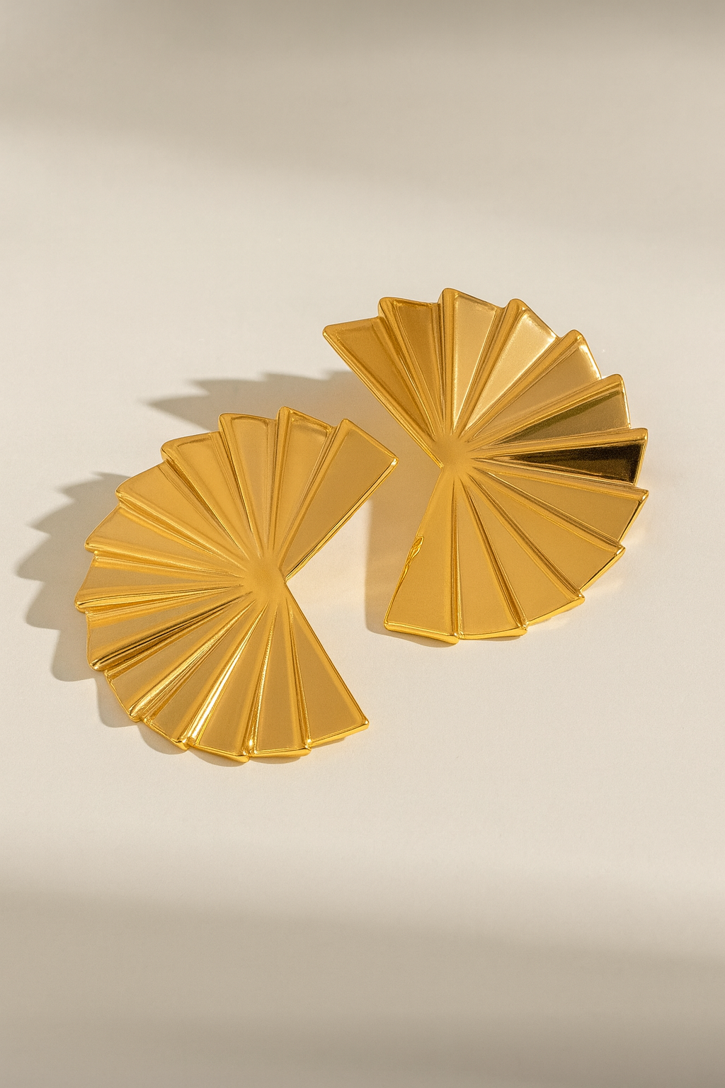 Inspired by the elegance of unfolding fans, the Lumen Wings Earrings are crafted in radiant gold-plating with sculptural folds that catch and reflect the light beautifully. Bold yet refined, they make a statement piece that elevates both day and evening looks.