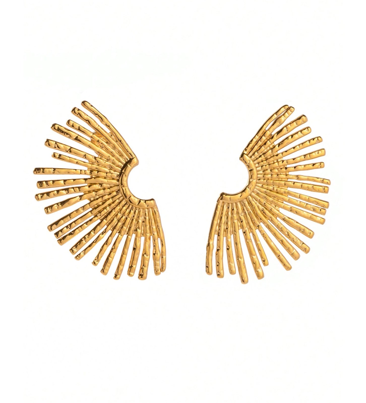 lluminate your style with the brilliance of the Solara Rays earring. Crafted in gold-plated perfection, its radiant fan-like design bursts outward like beams of sunlight, symbolizing energy, power, and confidence. A striking statement piece that blends bold geometry with timeless elegance, perfect for those who love to shine unapologetically.